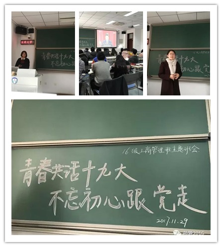 2017年11月29日,为了深入学习和贯彻落实党的十九大精神,2016级工商管理(药事管理)班召开了“青春共话十九大不忘初心跟党走”主题班会。班会由团支书王欣怡主持,班主任关健老师以及班级38名同学到场。