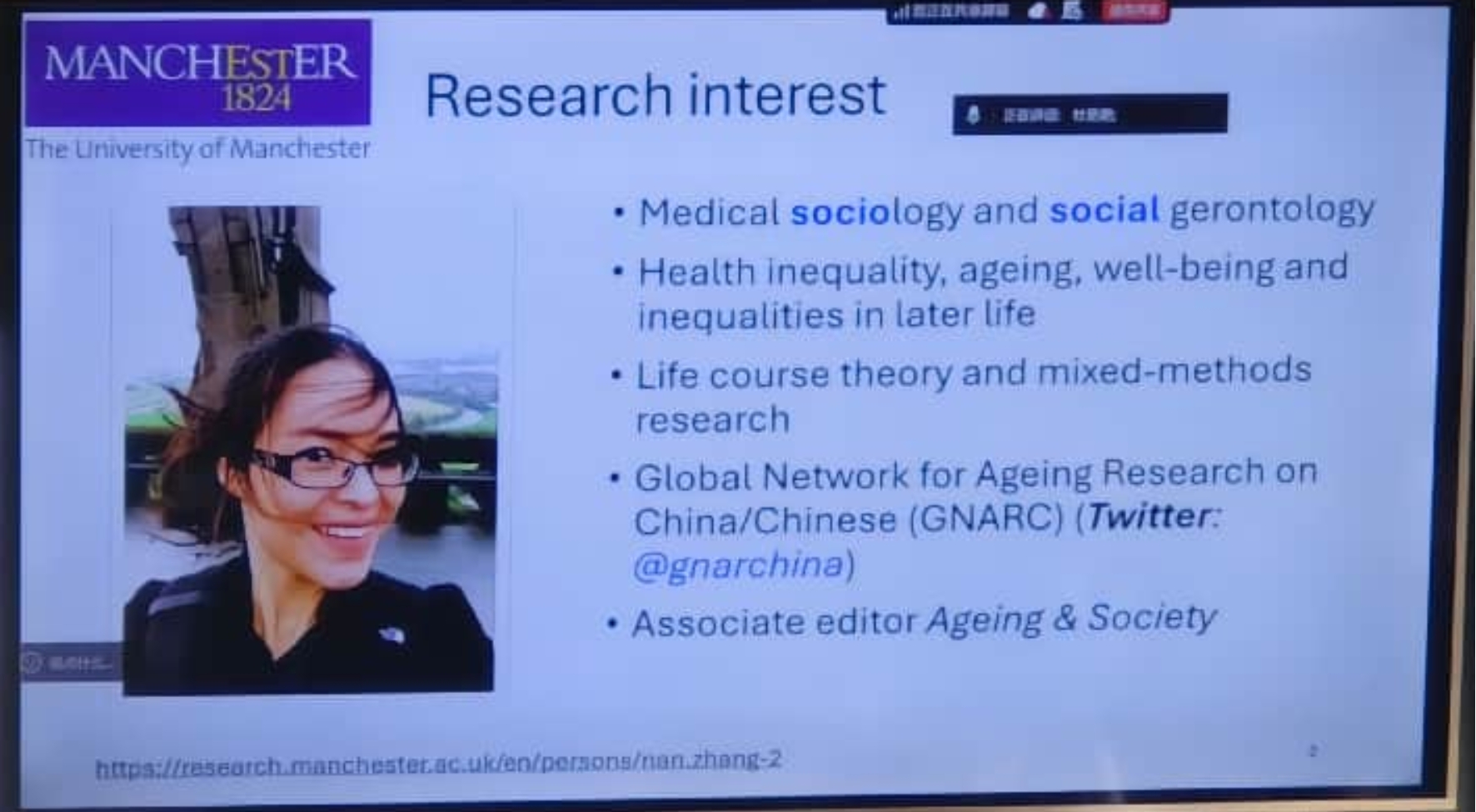 首先,张楠老师介绍了曼彻斯特大学关于老龄化和健康不平等方面的研究,包括华裔老年人的研究网络、对老年友好社区或老年友好城市的研究等,强调要注重定性和定量混合方法学的运用。