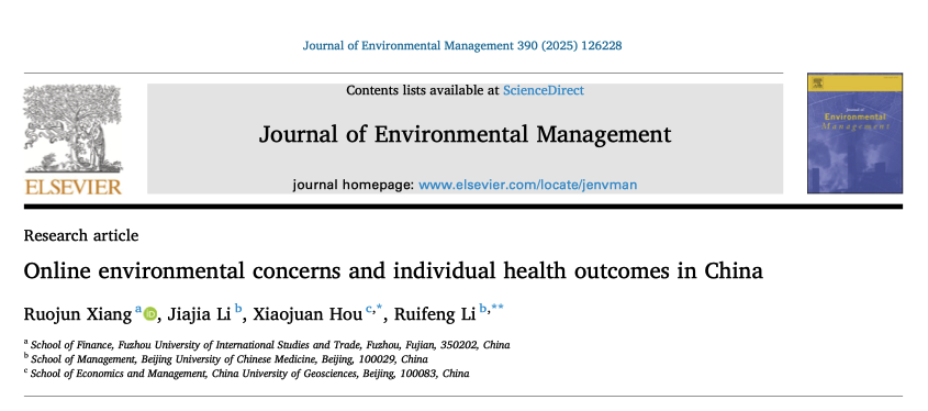 304永利集团李瑞锋教授、博士研究生向若君以及硕士研究生李佳佳,在环境管理领域国际顶级期刊Journal of Environmental Management(JEM)发表题为“Online environmental concerns and individual health outcomes in China”的创新性研究。文章通过匹配百度搜索指数与中国健康与营养调查(CHNS)数据库,揭示了提升网络环境关注度对个体健康具有积极影响,为“健康中国2030”与“双碳”战略协同推进提供理论参考。此项研究是李瑞锋教授团队围绕环境因素与居民健康行为、健康结果在JEM期刊上发表的系列研究的重要组成部分。此前,该团队于2024年在JEM发表了题为“Health risks from extreme heat in China: Evidence from health insurance”的研究成果。
