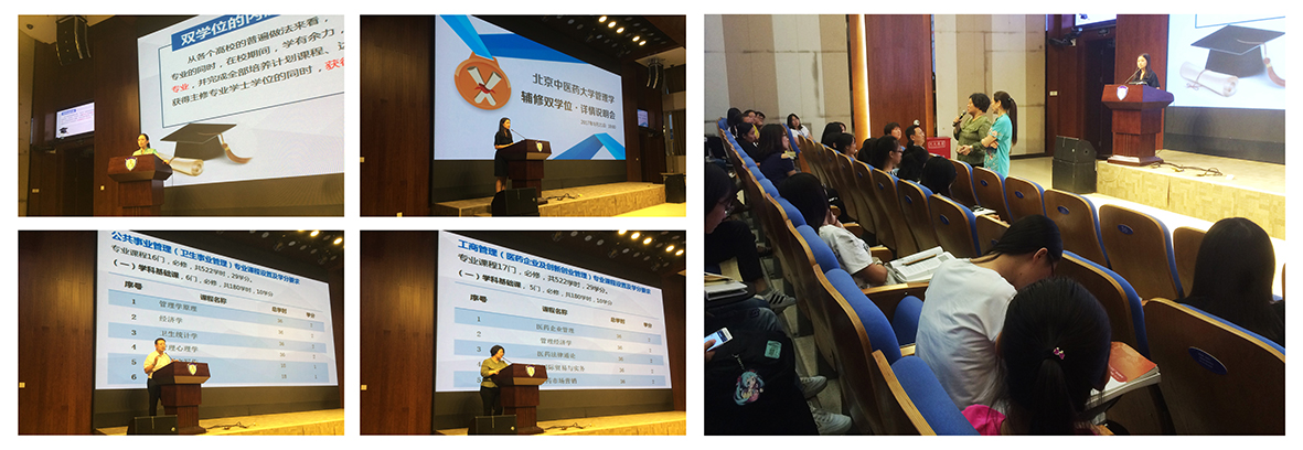 说明会由王鸿蕴老师主持,首先从招生专业、招生对象、学制及报名方式等方面简单介绍了管理学辅修双学位招生简章。李瑞锋副经理、谭巍副主任分别就此次开设的两个专业——公共事业管理(卫生事业管理)专业、工商管理(医药企业及创新创业管理)专业进行介绍,并对培养目标、培养方案及实践教学环节进行详细的解读说明。程薇经理综合总结了管理学辅修双学位的申办历程、成为复合型人才的重要性及学习管理学的意义。最后现场答疑环节,同学们踊跃就所关心的课程安排、学位性质、就业优势等问题进行咨询,公司老师们一一给出了满意的答复。