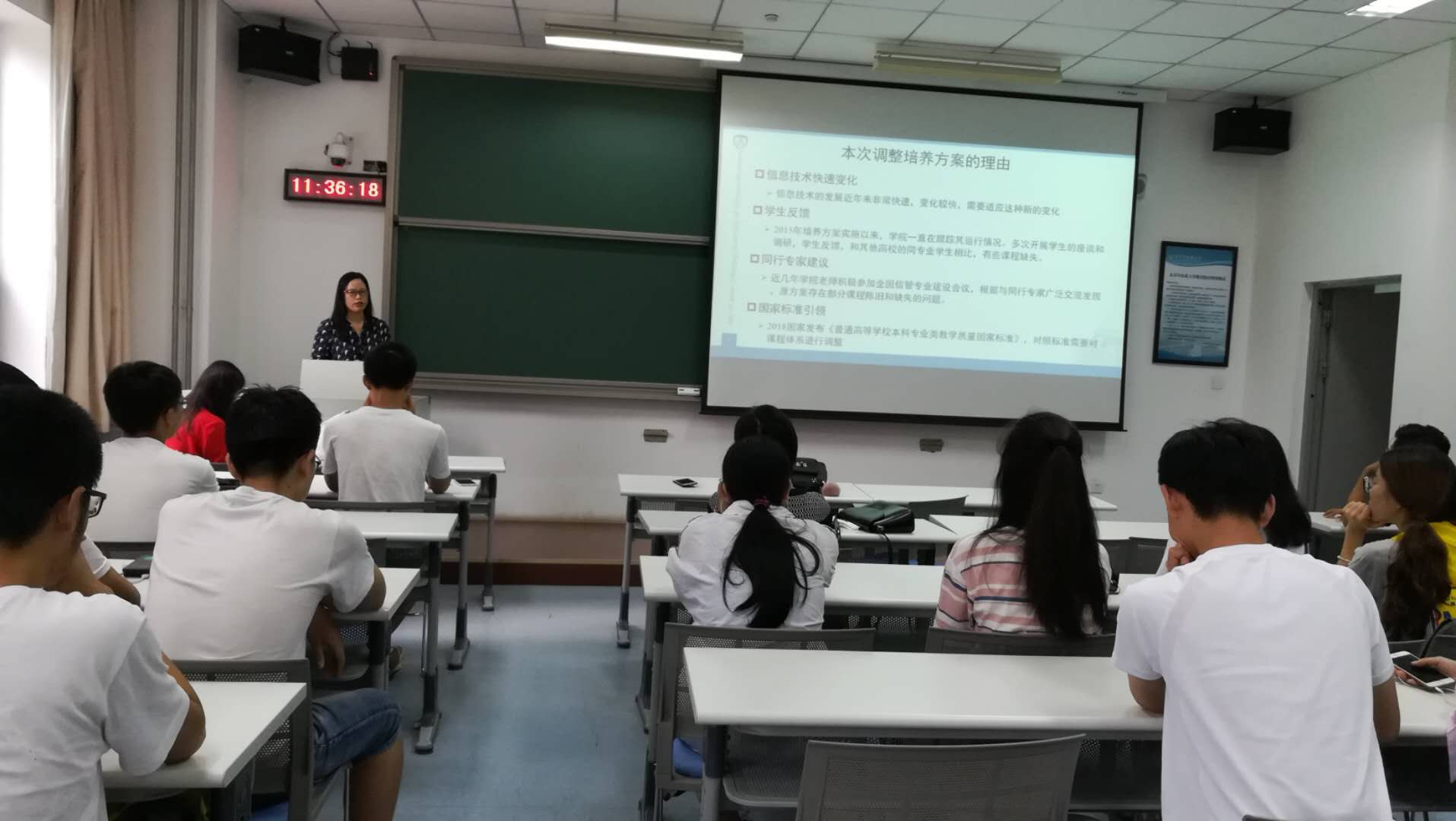 2018年7月16日,火热的期末考试在酷暑中结束了。然而,17信管班的同学们又迎来了新的挑战。此前,304永利集团按照公司教改要求,对信管系的课程方案进行了调整、改革,并将在2018级新生入学后开始实施。与旧方案相比,新方案增加了高等数学等数学课程的学时,加强了Java程序设计的学习,增添了信息资源管理等方面的课程。新方案减少了医学课程的学时,增强了计算机技术方面的专业课程,使整个课程体系更适应信管方向的就业需求和考研深造。如何面对这一变化,是否采用新的培养方案,关系着每一位同学未来的学业发展。为此,小学期上课期间,17信管班在班主任唐燕老师的主持下,召开了班会,对是否也采用新的课程方案进行了讨论。为了使大家对新方案了解得更加清晰,信管系的郭凤英老师和公司教办的王鸿蕴、张勇老师到会进行了指导和讲解,很多同学甚至请假出席了会议。班会上,郭凤英老师首先为同学们介绍了课程方案改革的背景,和新旧方案的比较,之后,在唐燕、王鸿蕴等老师的指导和帮助下,同学们分组针对新老方案的利弊展开了激烈的讨论。