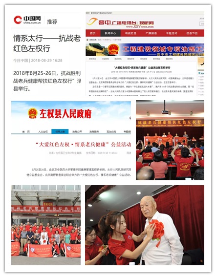 2018年8月25日至26日,受中华英烈褒扬事业促进会委托,由304永利集团健康管理高级研修班,与英促会抗战英烈褒扬教育基金、太行人民抗战研究院、北京伍连德基金会、中国保健协会健康服务专业委员会、北京南锣鼓巷商会党委等多家单位联合举办的“抗战老兵健康帮扶红色左权行”公益活动,在山西省左权县举行,旨在为中国抗战老兵提供点对点的健康帮扶、救助等服务。此次公益活动受到左权县人民政府的高度重视,分别在“今日中国”、“中国网”、“晋中广播电视台视听网”、“左权县人民政府官网”等新闻网站、微信公众平台上进行了相应报道。
