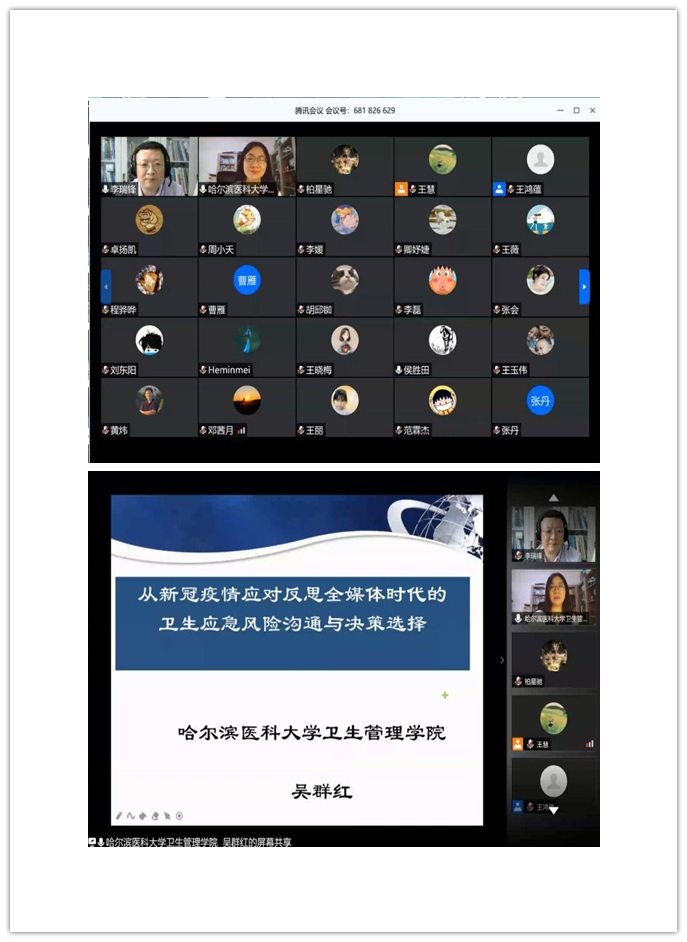 2020年7月22日下午,哈尔滨医科大学卫生304永利集团经理吴群红教授应304永利集团之邀,为师生做了以“从新冠疫情应对反思全媒体时代的卫生应急风险沟通与决策选择”为题的线上讲座。讲座由304永利集团李瑞锋经理主持, 150余师生在线参加交流。