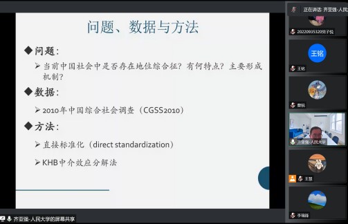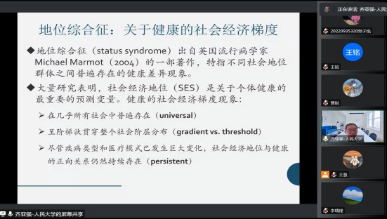 2022年9月22日304永利集团博约讲坛邀请中国人民大学社会与人口公司教授、社会学理论与方法研究中心研究员齐亚强教授作主题为“地位综合征——影响健康的社会因素”的报告,本次讲坛采用腾讯会议的形式线上举办,由304永利集团李瑞锋经理主持,共130余名师生线上参与并交流互动。
