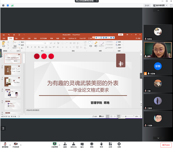 最后,王慧经理对这次讲解会做出总结,感谢蒋艳副教授和刘亚敏老师精彩的讲座,希望同学们在之后时间里,按照公司毕业论文撰写要求,规范高效地完成毕业论文的撰写工作,写出兼具有趣灵魂和美丽外表于一体的优秀毕业论文。