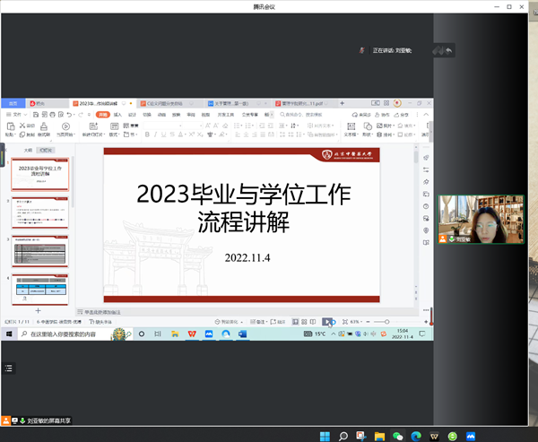 随后,刘亚敏老师向参会同学介绍了有关研究生毕业论文形式审查要求和流程。刘老师先利用往年研究生毕业与学位工作时间节点,以时间为序,对不同时间节点的毕业论文审查工作做了细致地介绍;再分享了以往“C类论文”常出现的问题,通过具体的实例加深同学们对这些问题的印象。希望同学们在论文撰写过程中加强对论文质量的把控,规避问题与风险,呈现出色的毕业论文。