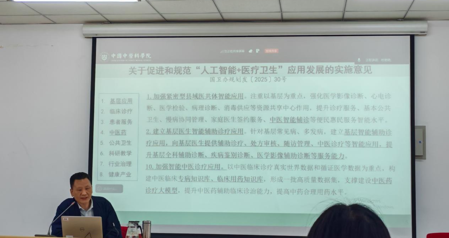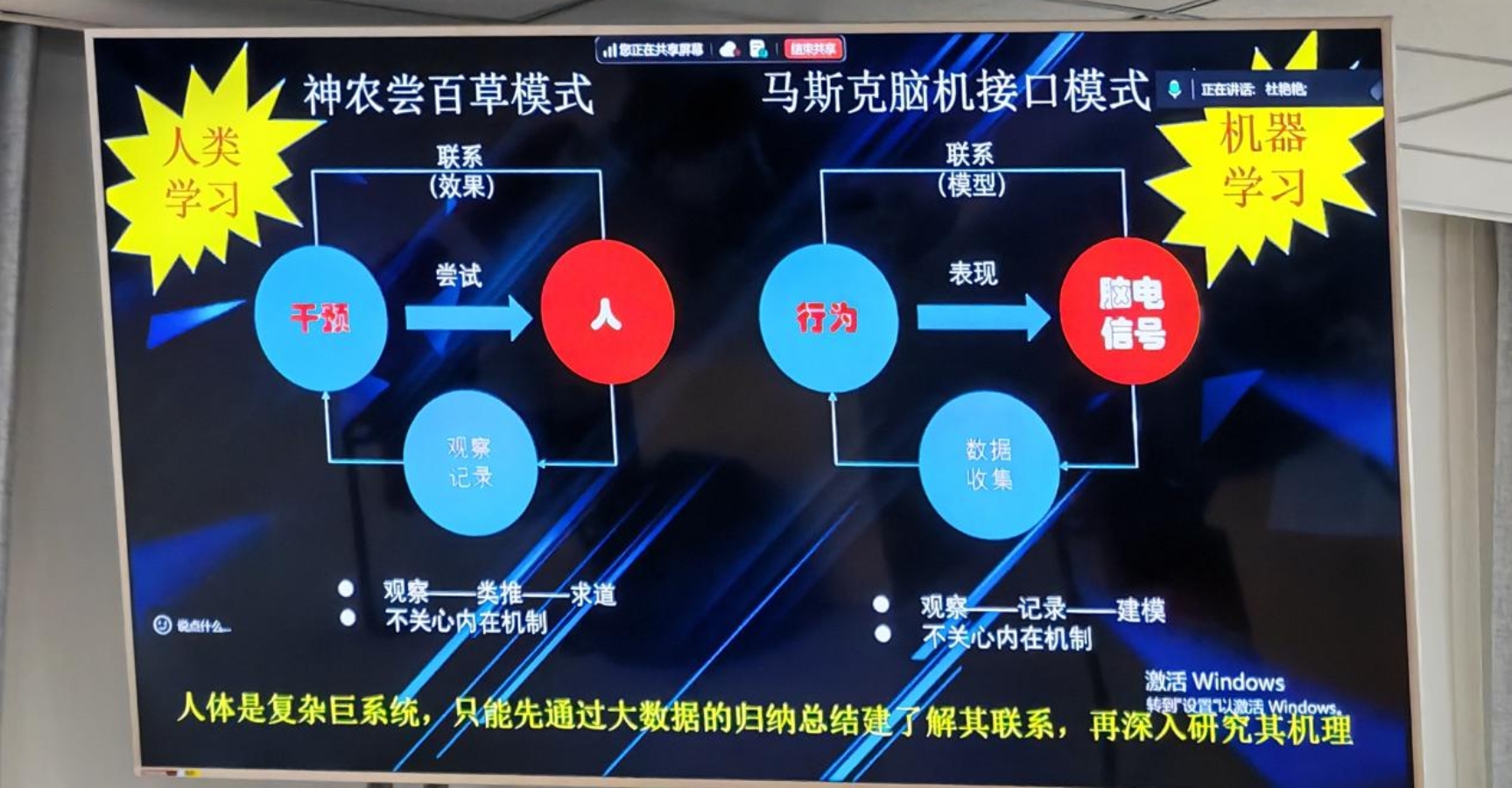 随后,报告引入神农查百草传统模式与马斯克脑机接口现代科技模式进行对比解读,立足古今双重视角论证中医药理论体系的科学性,深入探讨现代前沿技术与中医药传承创新深度融合的实现路径。同时强调,数据向临床信息的提炼转化,是医务工作者专业成长与临床能力提升的核心关键,为师生拓宽了跨学科研究视野。