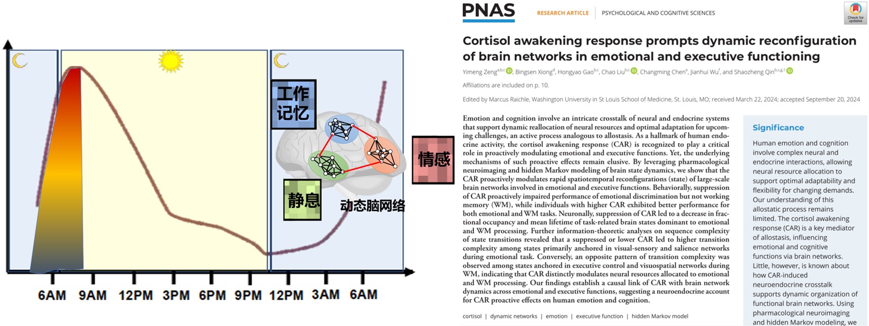 2024年12月,304永利集团青年教师曾奕萌博士在国际综合性学术顶刊Proceedings of the National Academy of Sciences of the United States of America(PNAS)(自然指数期刊,中科院1区TOP期刊,影响因子9.4)发表题为“Cortisol Awakening Response Prompts Dynamic Reconfiguration of Brain Networks in Emotional and Executive Functioning”的研究论文(www.pnas.org/doi/10.1073/pnas.2405850121)。该论文深入探讨了人体压力激素皮质醇的晨起觉醒反应如何通过影响人脑复杂网络的重组来帮助个体提高应对情感与认知挑战的神经计算机制。304永利集团青年教师曾奕萌博士为论文第一作者,304永利集团官网为第一单位。